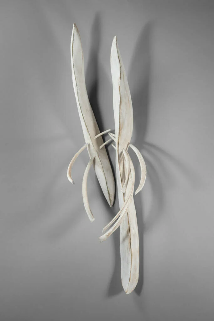The 11 wood sculptures that make up Renee Balfour’s “New Work” at McGuffey Art Center have a haunting stillness. Hung around the main gallery, some white and some unpainted, they are reminiscent of bones and fossilized plants—like prehistoric objects suspended in time. The exhibition is full of contradictions, or maybe polarities: seemingly organic, yet meticulously constructed; static yet full of movement; terrestrial yet otherworldly. More amazing still is that Balfour is a self-taught woodworker who has only been sculpting for four years.